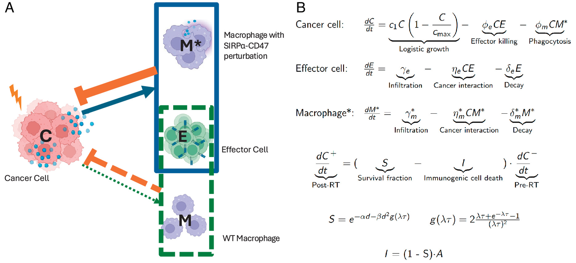 该研究旨在量化免疫原性细胞死亡(ICD)在放疗联合靶向SIRPα-CD47轴巨噬细胞免疫治疗中的贡献。为此,研究构建了数学模型,整合放疗、ICD及SIRPα-CD47信号通路,并利用临床前小鼠模型数据校准。研究发现,单纯放疗在野生型(WT)小鼠中诱导的ICD极微弱,而破坏SIRPα-CD47轴则能显著增强吞噬作用和系统性免疫激活。